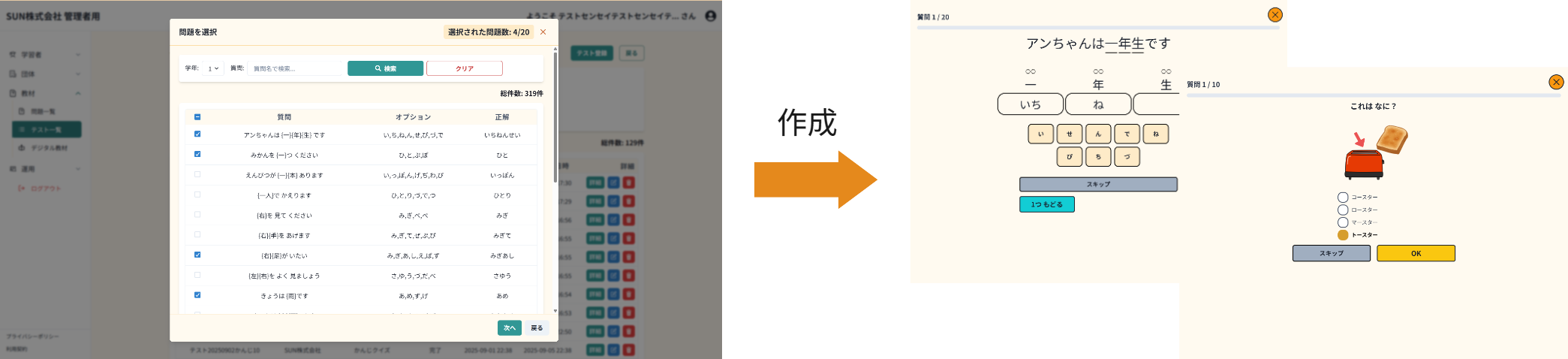 デジタル教材の問題を使って、自由にテストを作成することができます。